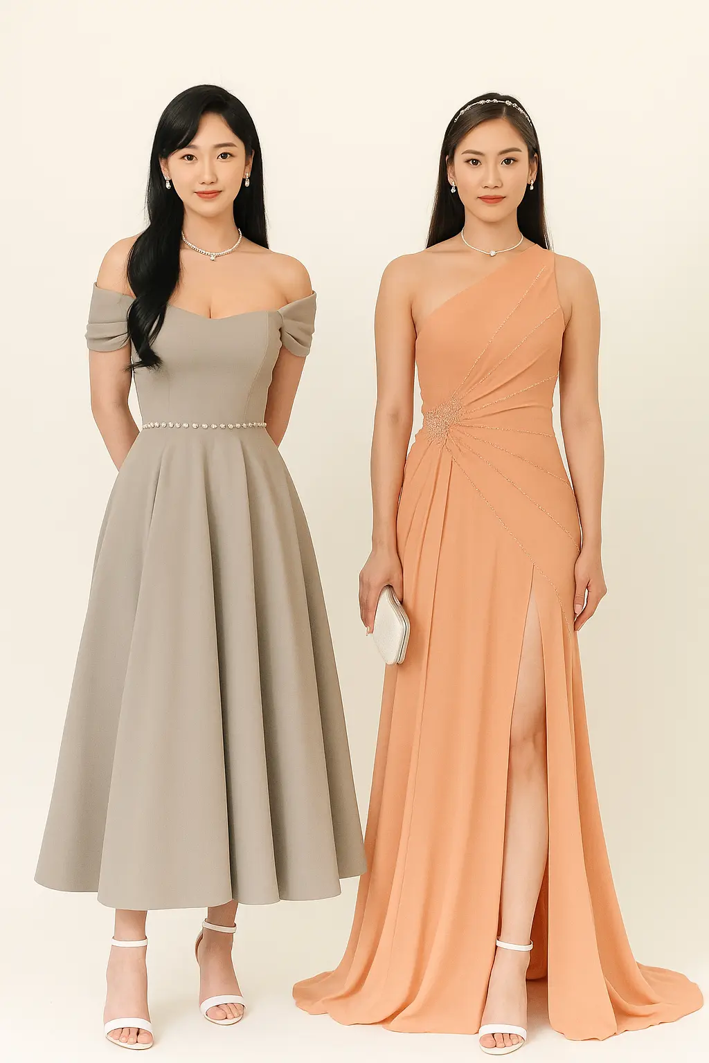 Semi-formal: mocha, dark brown, champagne, beige, cream.